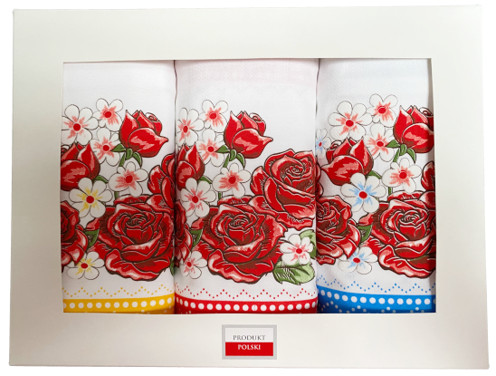 Zestaw 3 ścierek bawełnianych do kuchni z nadrukiem Róż. Nowoczesne i ciekawe wzornictwo sprawdzi się w każdej kuchni, zarówno tej o klasycznym jak i nowoczesnym charakterze. Ściereczka została w całości uszyta oraz nadrukowana w Polsce. Dzięki wykonaniu ścierki ze 100% bawełny ściereczki dobrze chłoną wodę.