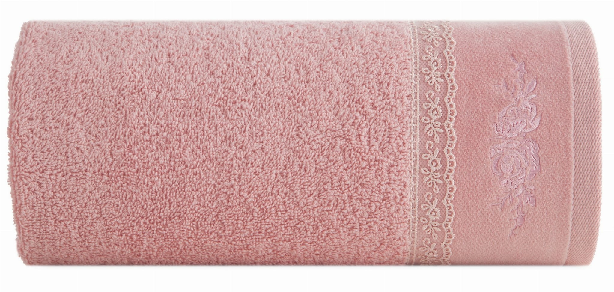 Ręcznik bawełniany Sisi w kolorze różowym został wyprodukowany przez znaną i cenioną markę Eurofirany. Został wykonany z wysokiej jakości przędzy frotte, składającej się w 100% bawełny, która zapewnia wysokie właściwości higroskopijne czyli zdolność pochłaniania wilgoci. Charakteryzuje się wysoką i najbardziej optymalną do codziennego użytku gramaturą 500 g/m², dzięki której szybko schnie. Dodatkowo ręcznik Sisi cechuje się przyjemnym i miękkim chwytem z piękną welurową bordiurą w formie serduszek wypełnionych różyczkami. Elegancka ale minimalistyczna część ozdobna świetnie odnajdzie się w klasycznych jak i nowoczesnych wnętrzach tym bardziej, że ręcznik występuje w bardzo bogatej kolorystyce. Z pewnością zadowolą klientów szukających wysokiej jakości w połączeniu z atrakcyjną ceną i eleganckim designem.