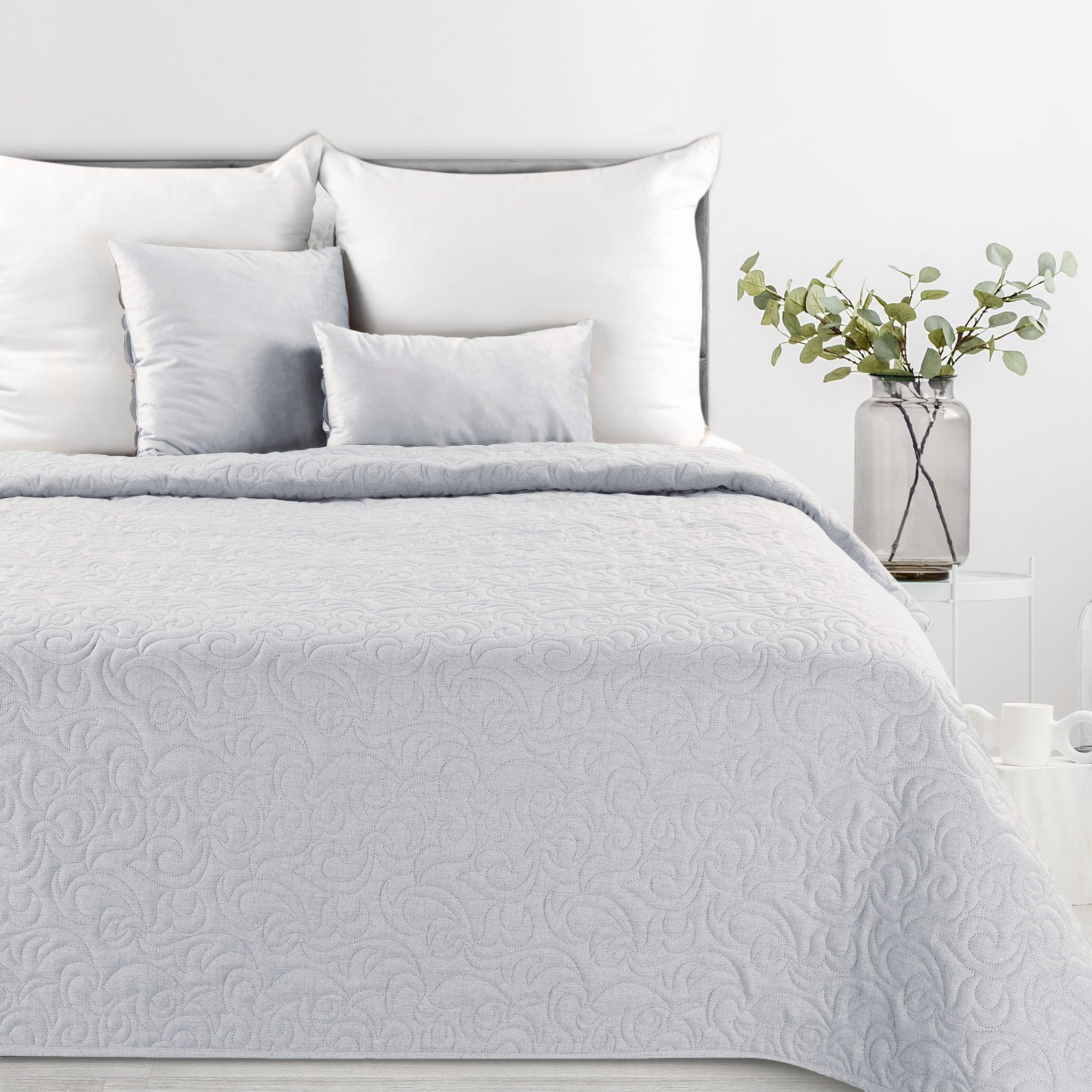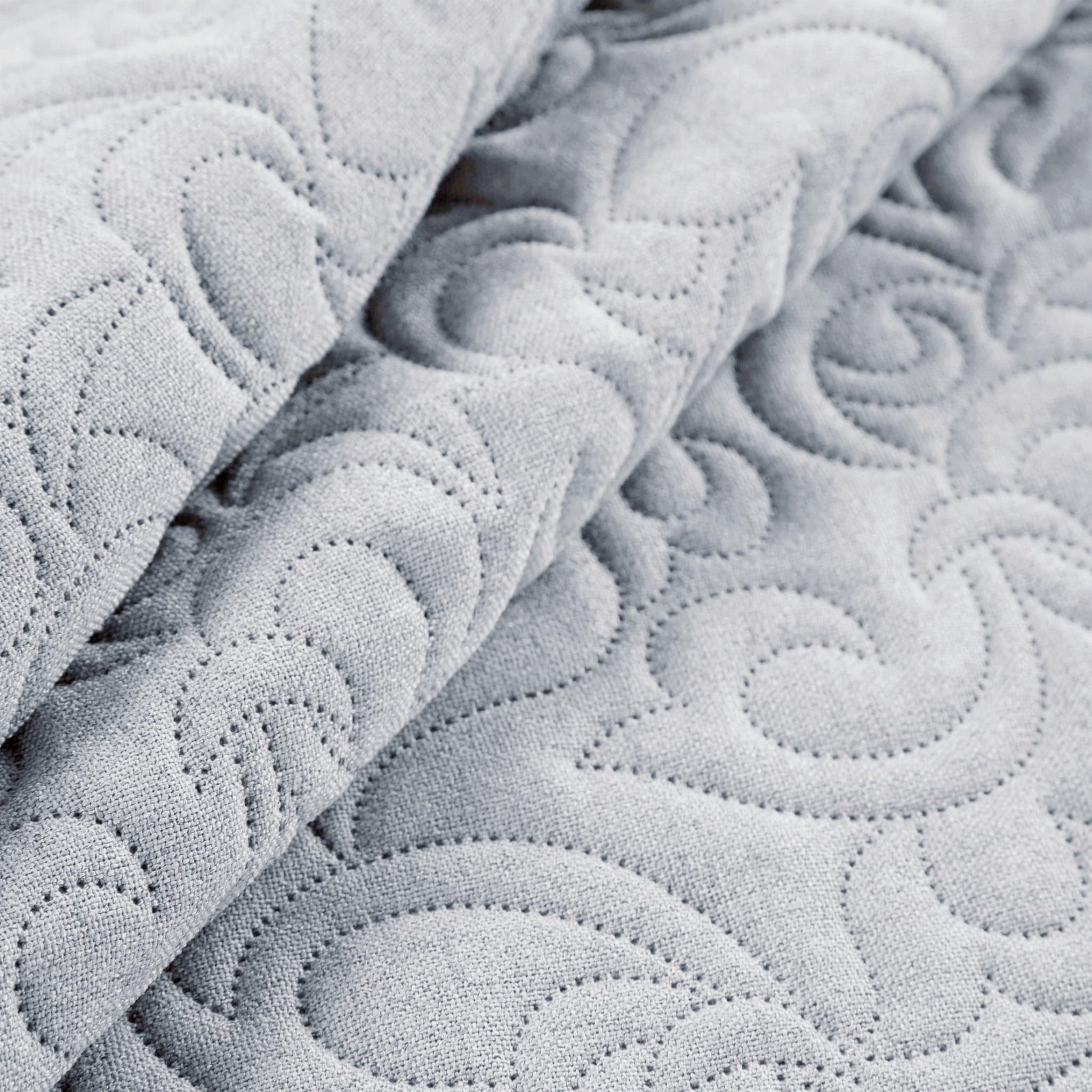 Narzuta pikowana na łóżko Len 4 220x240 w kolorze srebrnym została wykonana na zlecenie firmy Eurofirany z 100% poliestru. Pełni ona nie tylko funkcję dekoracyjną w naszej sypialni elegancko prezentując się na łóżku, ale jednocześnie zabezpiecza pościel przed wybrudzeniem. Narzuta została starannie wykonana i ma jednobarwny kolor oraz posiada imitację lnu a na brzegach obszyta jest lamówką. Eleganckie pikowanie zostało wykonane metodą hot press czyli bez użycia nici i igieł dlatego jej powierzchnia jest miła i przyjemna w dotyku. Pikowanie za pomocą termo-zgrzewania ma wiele zalet a największym plusem jest powstanie trwałego materiału o dużej wytrzymałości.