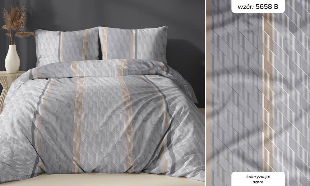 Pościel flanelowa 5658B 160x200 w odcieniach szarości jest doskonałą propozycją na chłodne jesienne i zimowe dni. Wzór został zaprojektowany przez polskich projektantów w modnych kolorach niebieskiego i zieleni. Powinien zatem idealnie komponować się w nowoczesnych sypialniach. Z pewnością taki komplet pościeli doda wiele ciepła i uzupełni wystrój w naszej sypialni. Pościel zimowa ogrzeje podczas chłodów ponieważ flanela to tkanina, która jest bardzo miękka i niezwykle przyjemna w dotyku dlatego tak dobrze sprawdza się podczas chłodnych nocy. Podwójny proces drapania tkaniny zapewnia komfort cieplny i przyjemność w kontakcie z ciałem. Pościel z flaneli produkowana jest z wysokiej jakości przędz czesanych, które sprawiają, że tkanina ma jednorodną powierzchnię i estetyczny wygląd. Dzięki wykonaniu w 100% z naturalnych włókien bawełnianych gwarantuje nam wysoki komfort snu oraz cyrkulację powietrza. Dokładne wykończenie, dbałość o detale oraz estetyczne opakowanie składa się na wysoką jakość produktu.