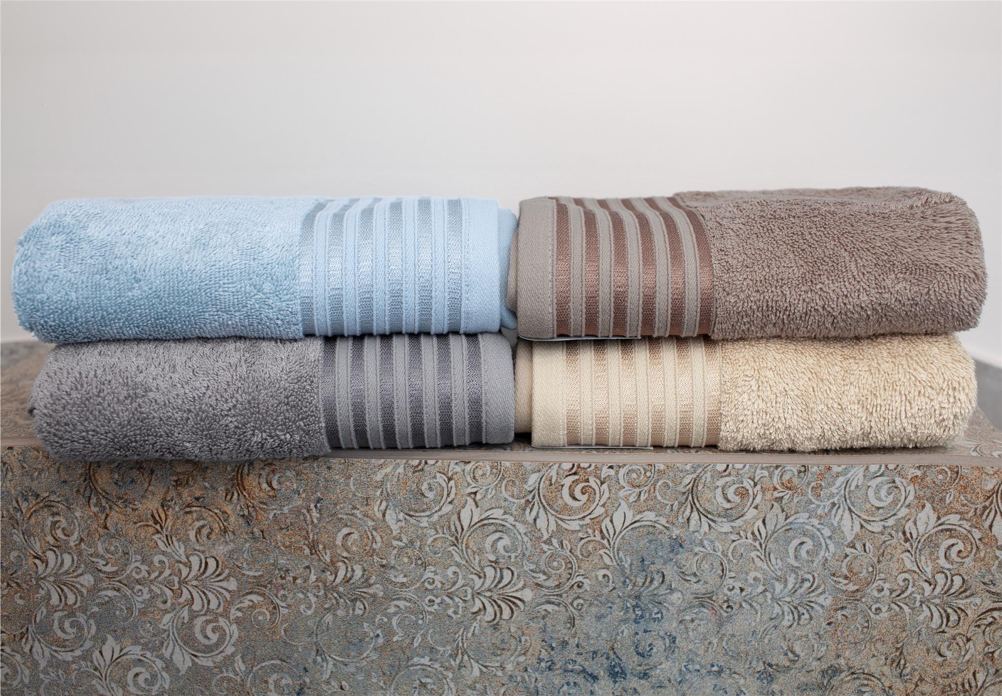 Ręcznik z Modalem Vela w kolorze taupe z ozdobną bordiurą w paski został wyprodukowany przez znaną i cenioną markę Faro. Został wykonany z wysokiej jakości przędzy, składającej się w 60% bawełny i 40% modalu, która zapewnia wysokie właściwości higroskopijne czyli zdolność pochłaniania wilgoci. Charakteryzuje się wysoką do codziennego użytku gramaturą 550 g/m², dzięki której szybko schnie. Dodatkowo ręcznik Vela z delikatną bordiurą cechuje się przyjemnym i miękkim chwytem. Świetnie odnajdzie się w klasycznych jak i nowoczesnych wnętrzach tym bardziej, że ręcznik występuje w bardzo bogatej kolorystyce. Z pewnością zadowolą klientów szukających wysokiej jakości w połączeniu z atrakcyjną ceną i eleganckim designem.