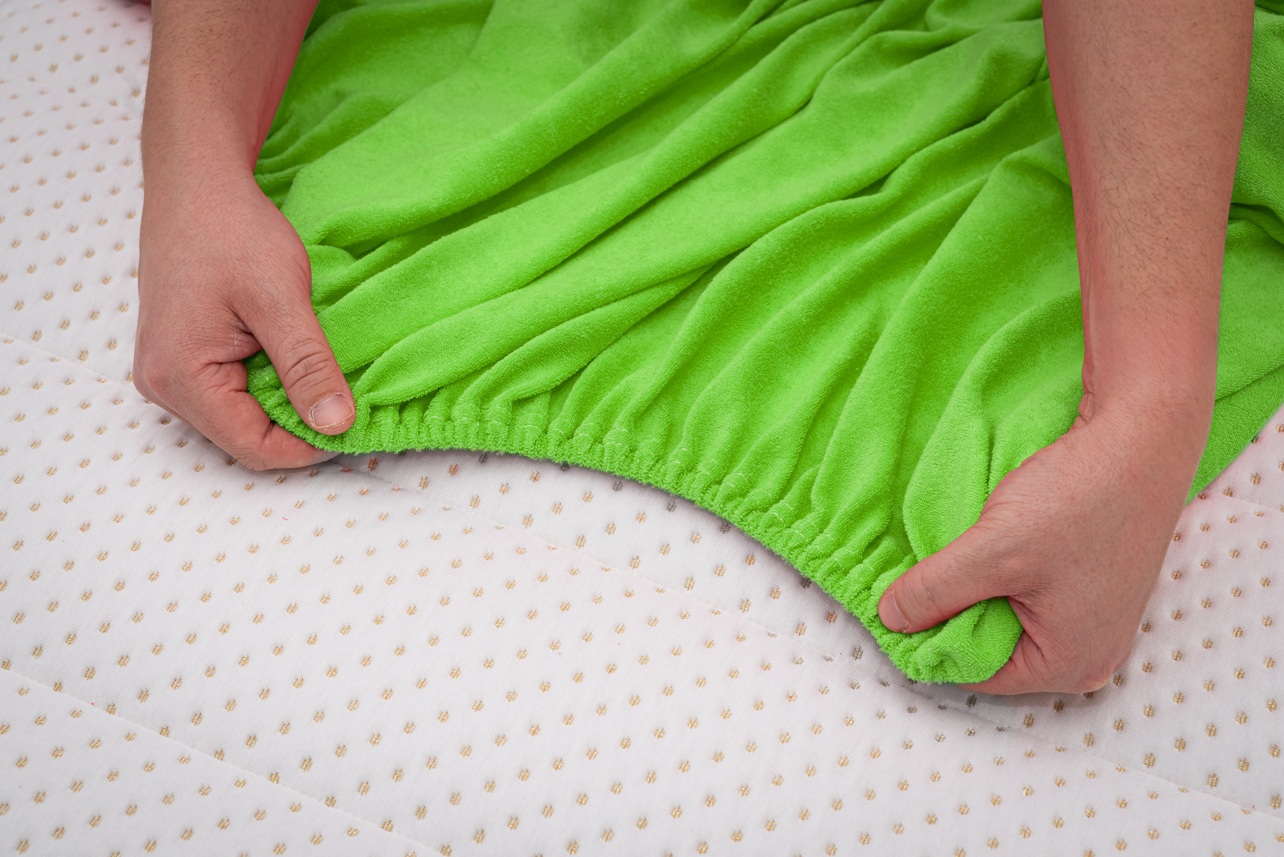 Prześcieradło frotte z gumką w kolorze trawiastej zieleni wykonane zostało z materiału frotte z wysokiej jakości przędzy czesanej. Dzianina składa się w 82% z bawełny i 18% z poliestru czyli tysięcy bawełnianych pętelek między którymi swobodnie przepływa powietrze. Taka proporcja bawełny do poliestru sprawia, że prześcieradło bardzo dobrze reguluje temperaturę ciała co zapobiega nadmiernemu poceniu się skóry a poliester gwarantuje ciągliwość i wytrzymałość oraz idealne dopasowanie do materaca. Prześcieradło frotte z gumką charakteryzuje się wykorzystaniem przędzy czesanej czyli najbardziej ekskluzywnej dostępnej na rynku o gramaturze 200g/m² która sprawia że prześcieradło jest grube, miękkie i przyjemne w dotyku.