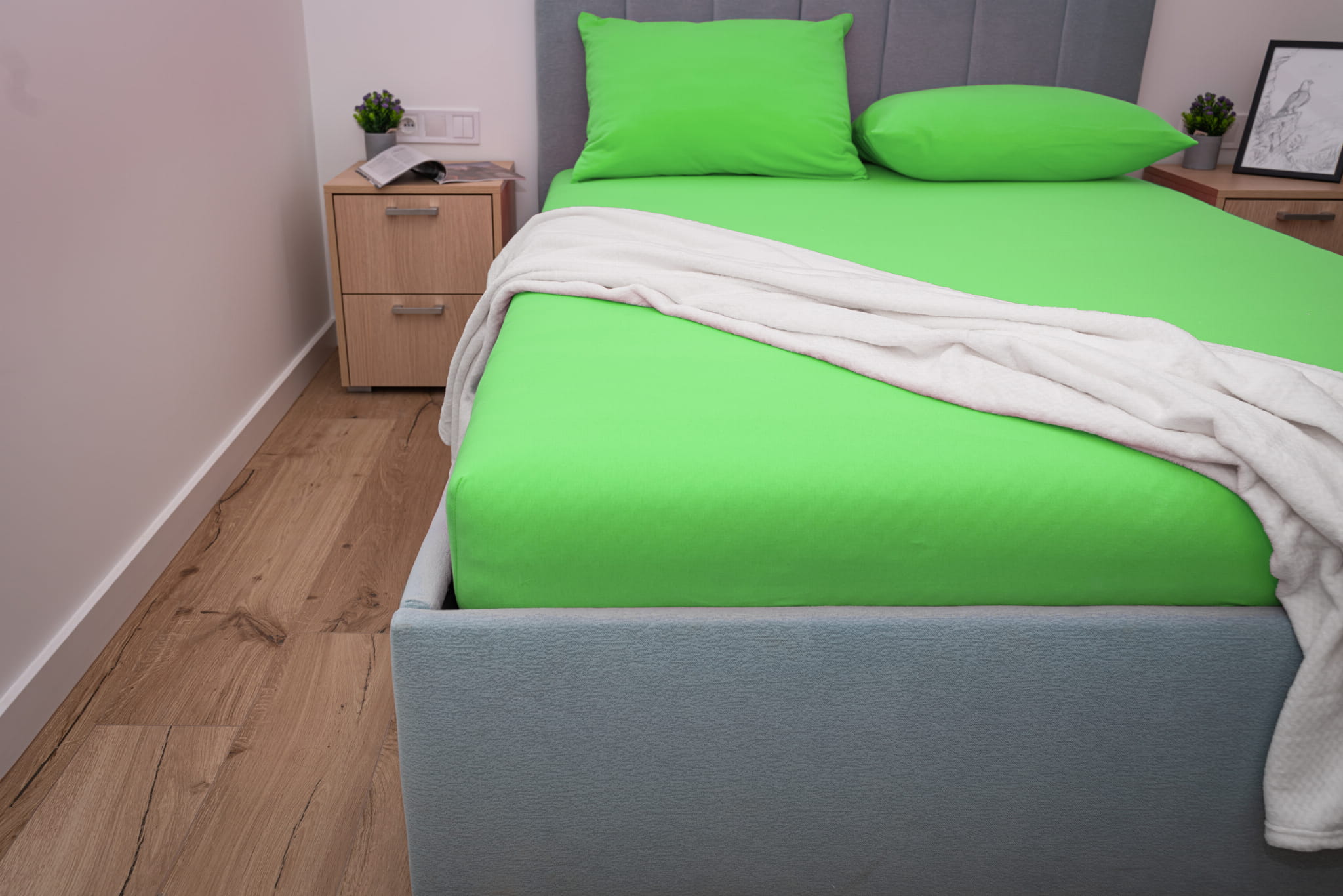 Prześcieradło jersey z gumką w kolorze zieleni trawiastej wykonane zostało z materiału jersey z wysokiej jakości przędzy czesanej składającej się w 100% z bawełny. Dzięki wykonaniu z naturalnych włókien bawełnianych prześcieradło bardzo dobrze reguluje temperaturę ciała co zapobiega nadmiernemu poceniu się skóry. Prześcieradło jersey z gumką charakteryzuje się wykorzystaniem przędzy czesanej czyli najbardziej ekskluzywnej dostępnej na rynku o gramaturze 155 g/m² która sprawia że prześcieradło jest gładkie, miękkie i aksamitne w dotyku.