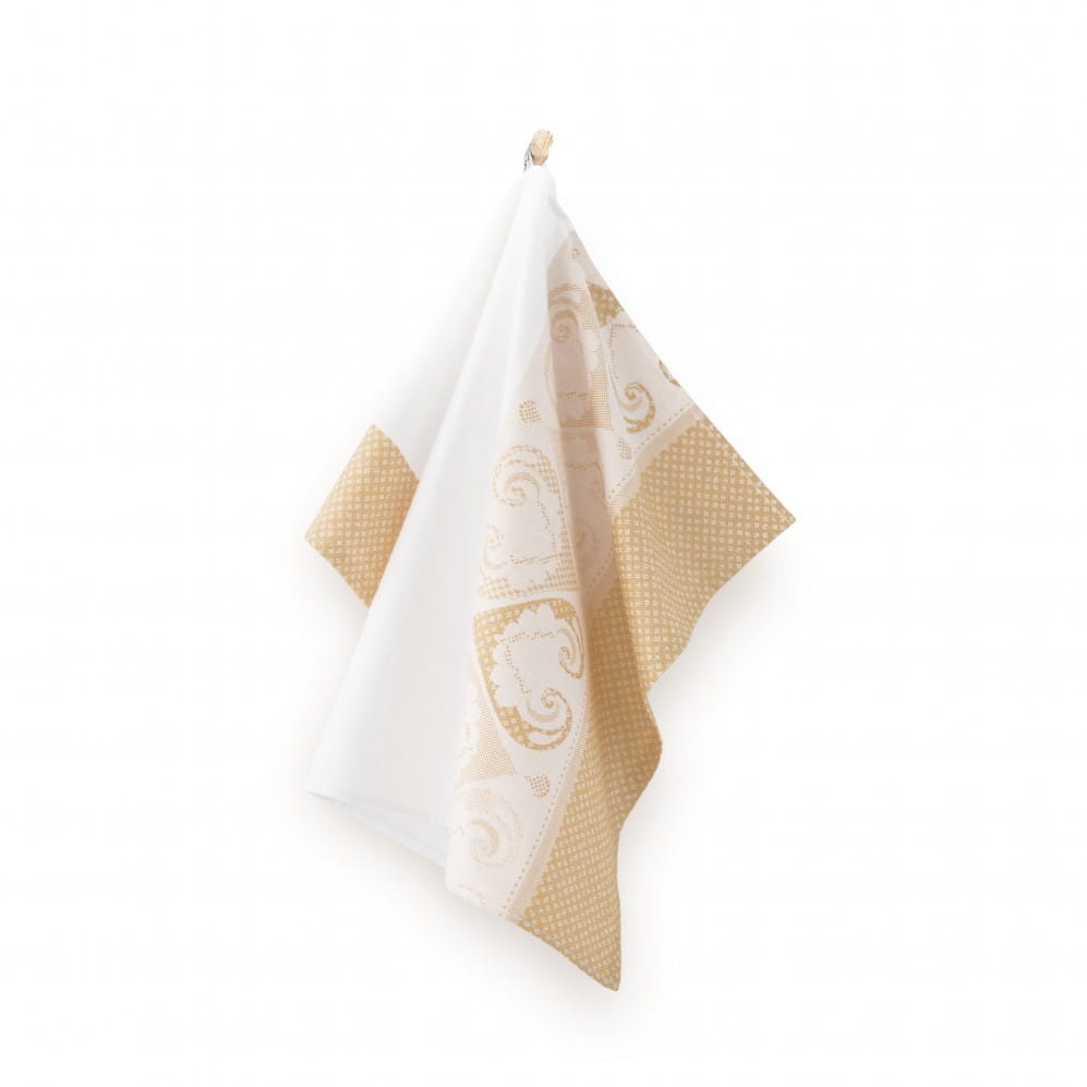 Luksusowa ściereczka Ankara 50x70 w kolorze złotym z bawełny egipskiej firmy Zwoltex. Ścierka kuchenna o doskonałej jakości włókna bambusowego. Technologia Ultrasoft zapewnia miękkość, znakomitą chłonność oraz najlepsze walory użytkowe. Nowoczesne wzornictwo i przyjemna dla oka kolorystyka sprawiają, że ten produkt jest nie tylko praktycznym gadżetem do Twojego domu, ale także efektowną dekoracją. Modny wzór ozdobi kuchenne wnętrza urządzone w każdym stylu. Tkana techniką żakardową. Gramatura: 240 g/m2