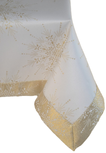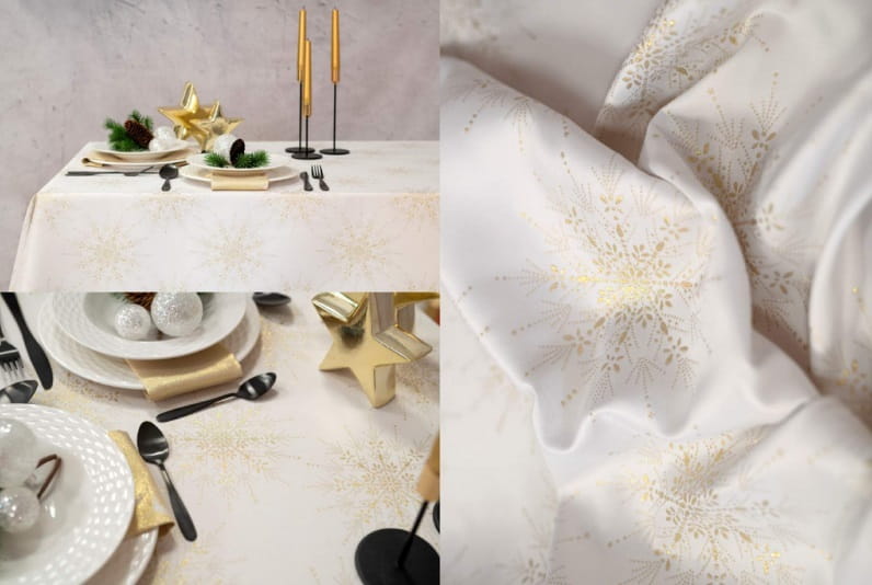 Obrus dekoracyjny, plamoodporny, błyszczący Gwiazdki to kolekcja obrusów stworzona z myślą o osobach, które podążają za aktualnymi trendami w wystroju wnętrz! Idealnie pasuje do nowoczesnego i klasycznego wnętrza. Subtelności obrusu dodaje zdobienie brzegu w postaci oryginalnego podwinięcia 5 cm. Produkt został wyprodukowany w Polsce.